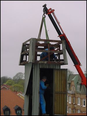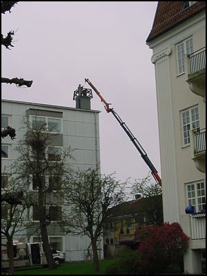 Här demonteras en skorsten som är 22 meter hög. Till hjälp finns en av våra kranbilar utrustad med jibb.
